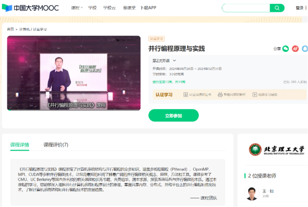 研究所成员在中国大学MOOC和学堂在线开设了3门公开课,其中“大数据基础与应用”被评为国家级精品在线课程,“并行编程原理与实践”是国内目前唯一一门并行编程/并行计算领域的慕课。